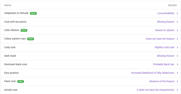 This report lists the physical and behavioral traits encoded in your pet’s DNA. Each trait detected is accompanied by a clear description, such as “low probability” or “not expressed,” etc.